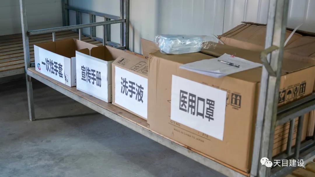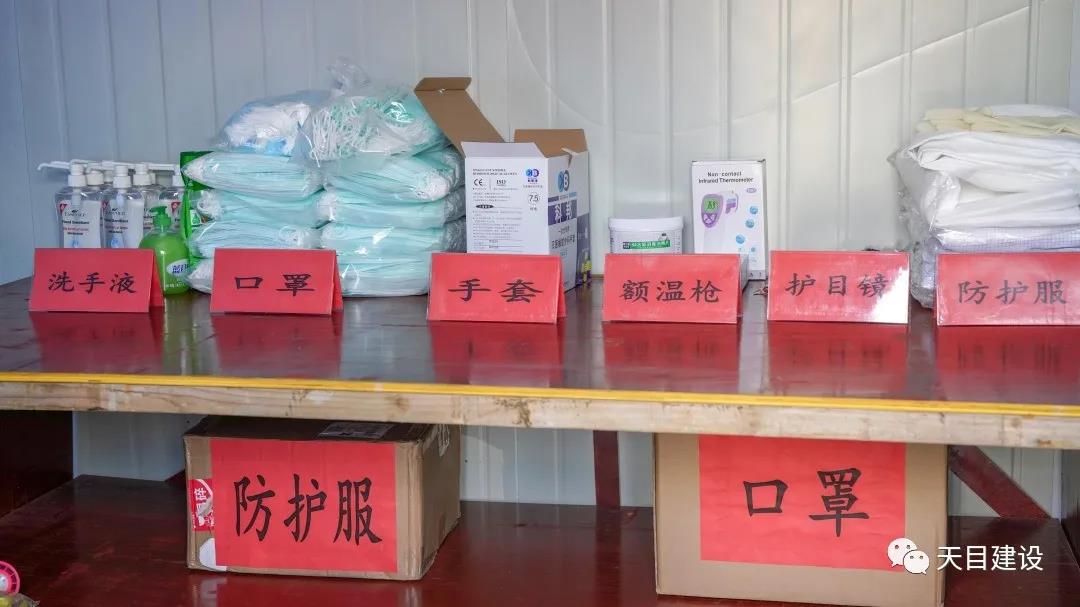 在常州一中工程項目施工現(xiàn)場,儲備室內(nèi)的防疫防護(hù)物資堆放整齊有序,噴灑器、84消毒液、護(hù)目鏡、醫(yī)用一次性口罩、洗手液、防護(hù)手套等防控物資準(zhǔn)備充足,工人們正在有序的開展施工作業(yè)。